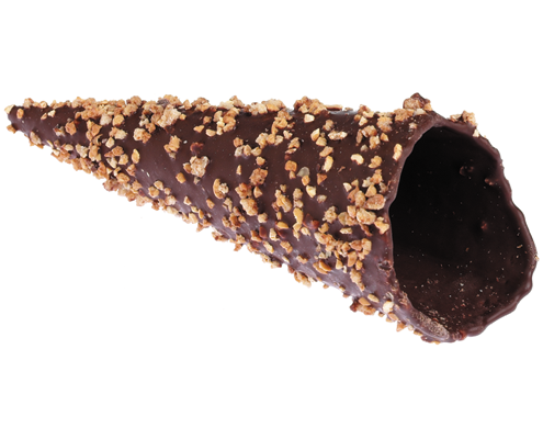 Cono de barquillo recubierto por un delicioso chocolate negro y crocanti de almendra.